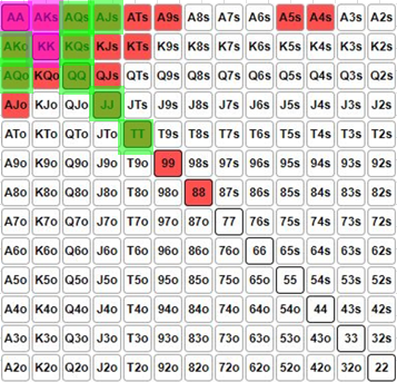 Вопрос, что мы защищаем на 4бет коллом, что пихаем? По ГТО нам нужно защищать 50% спектра, следовательно получаем примерно вот что: