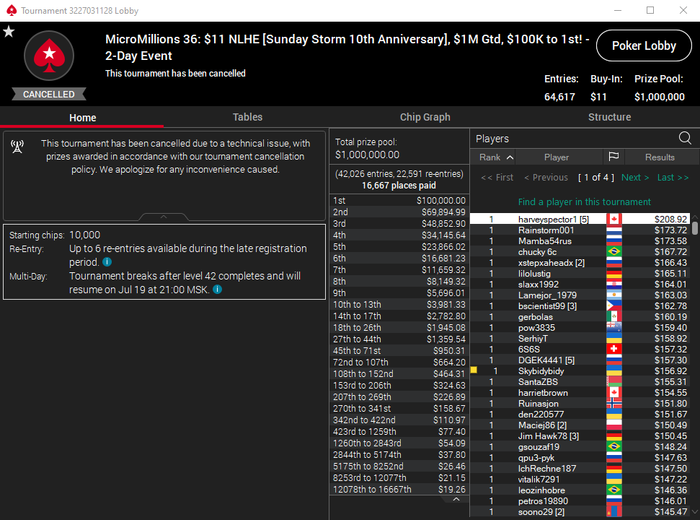 И что мы видим по итогу? За 5-ть минут до окончания регистрации турнир Sunday Storm ставится на паузу, остальные турниры работают в штатном режиме, ни сообщений, ни какой либо информации, оповещаний. Игроки затаили ожидание, начали гадать и подозревать что-то неладное, блайнды растут, люди ждут. Спустя ~30минут возобновляется турнир ровно на 1 раздачу, после чего ставиться на паузу и всплывает информационное окно с информацией о приостановке турнира, спустя пару минут появляется сообщение о том, что турнир по техническим причинам остановлен, и игрокам будет возвращён турнирный сбор и доп.выплата в виде пару формул и % от призового фонда.