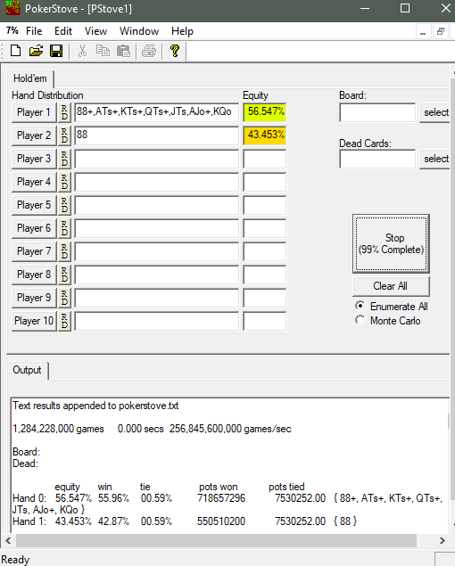Наглядный пример: Чисто в математической среде без рейка это будет плюсовый колл с 8ками против заданного мной диапа утг в 9.8% и рейза 3бб(а нам надо 40%эквити для колдколла на свободной позиции против заданного рейза) скажем на баттоне, но с учетом рейка этого вероятно недостаточно. Как рейк влияет на необходимость нужного нам эквити?