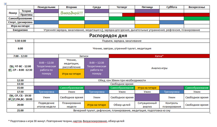 В общем первым делом надо привести в порядок свой режим дня. Когда то я составил шаблон на всю неделю