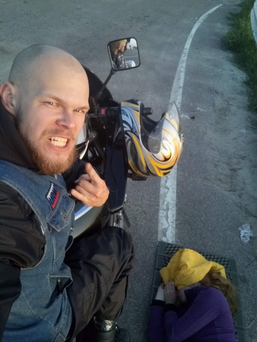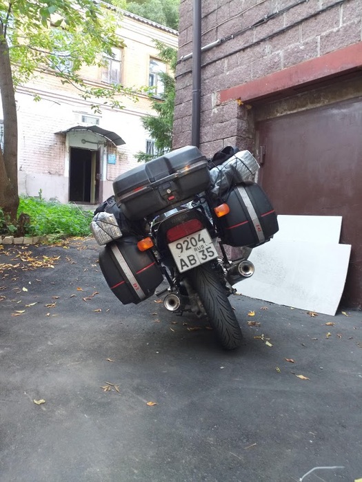 В Нижнем Новгороде подножка мотоцикла утопилась под асфальт сантиметров на 5, у меня уже несколько раз мотоцикл уходил под землю, теперь же я подозрительно отношусь и к асфальту. За одно можно оценить количество багажа. кофры в сумме на 120 литров, на кофрах под сетками куча всего было, + жена на себе рюкзак везла.