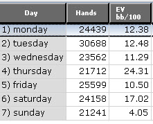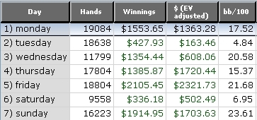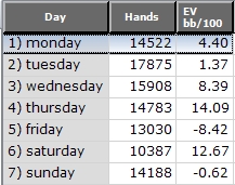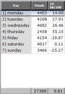 Я играю в ХА полгода и наиграл 172 000 рук. В разное время я играл разные лимиты, плохо или хорошо - единственное. что не могло влиять на мою игру и дисперсию - это дни недели (я не работаю и не пью по пятницам)