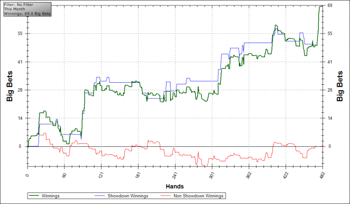 График по идее подчеркивает особенности раш покера - такой красной линии в лимите не бывает. На дистанции она, конечно, упадет, но тем не менее - в других видах, кроме ХА, у меня такой красной в лимите не было и за 100 рук...