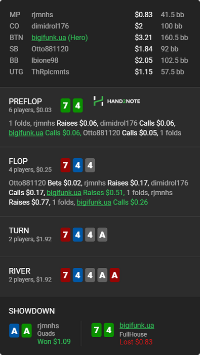 Это раздача , довольно забавная) по-этому решил поделиться) с 74s наверное не стоит колоть , даже на батоне) но я захотел , люблю "КогтиОрла" . Кеш Аут был 92%)) зажал нажать , так как мой тренер говорит что это сильно хавает ЕВ) ну а что было дальше сами видите ))) , и да наверно тут не стоило рейзить по-флопу , а добирать с блефов , и овер пары все равно проплатят!
