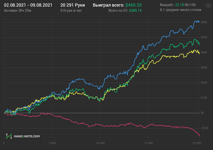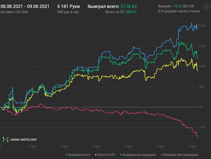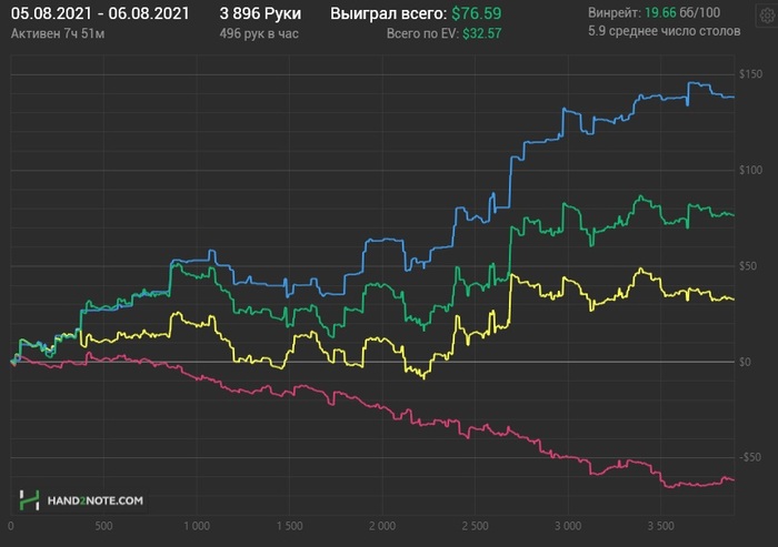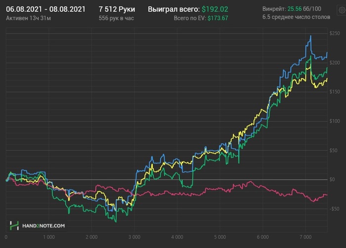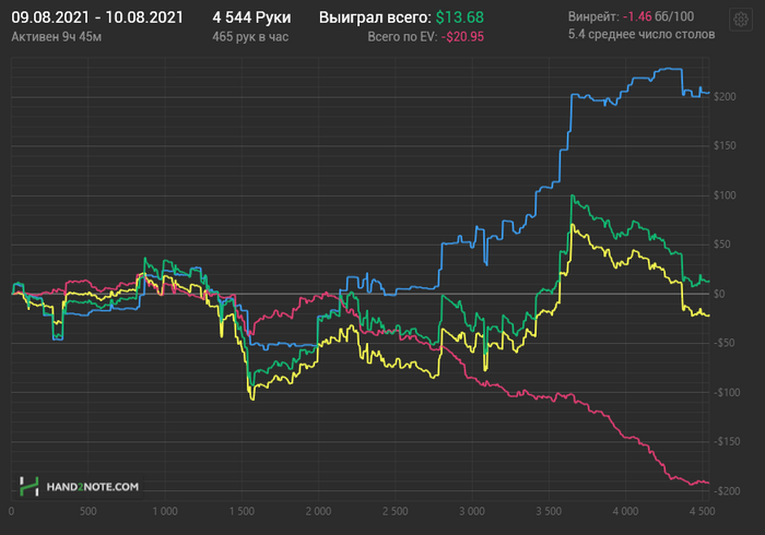 2 день, Собирается статистика на оппов и подумываю достать старую портянку с префлоп чартами. Главное не перемудрить за столами. Тут вступает в игру психология, помню что когда что то пытался изменить в стратегии - тильтовал. На многое нужно изменить точку зрения. Раньше не могу закрыть стол с очень слабым игроком, хотя был уже уставшим и был высокий риск улететь в животный тильт.