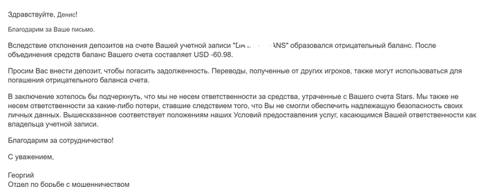 2. Если не на твоё, потребовать объяснения у старзов, почему они вывели деньги на чужой нетеллер. Спросить, если у них действительно правила такое позволяют, то что нужно сделать чтобы в дальнейшем такого не было. (Кстати, у тебя стоит двухфакторная аутентификация?)
