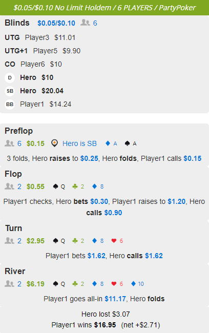 Frighthor, мне нравится как ты сыграл. так сыграть он мог с сетами и где то с q8, ожидая экшена от хорошей дамы и оверпар по сухой доске пока она не ухудшилась для тебя.