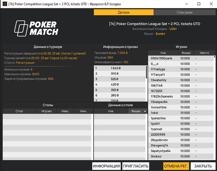 В данном фриролле можно выиграть один из 2-х билетов номиналом 60$ в чемпионат, также Покерматч добавил 7000грн (260$) в призовой фонд.