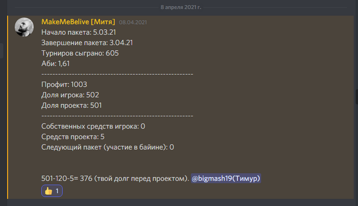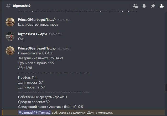 08.04.2021 года, мы с СЕО обсудили данный инцидент, где пришли к решению, что данный долг буду выплачивать частями, когда будет происходить расчёт средств по пакету. Изначально долг составлял 376$