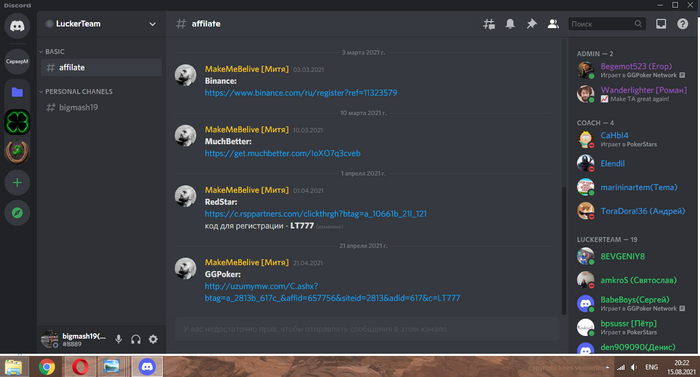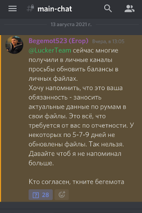 Договор у меня был на 5000 турниров. Оставалось вроде как 500 и меньше. Тем самым могу предположить, что отпускать и делить как-то мейк руководство не собиралось, поэтому решили написать они тут. Ну раз вы так решили сделать "красиво", я отвечаю вам тут, и не собираюсь молчать, когда вешают на меня клеймо. По поводу переговоров с ними, готов общаться только через 3-е лицо. Так как СЕО "Lucker Team" позволяет себе лишнего, допускает оскорбления и не любит когда не соглашаются с его позицией(общались на тему вакцинации, все писали свою точку зрению, и обсуждали это), и это не МОЁ предвзятое мнение, а мнение N-количество людей, которые либо в фонде, либо уже ушли с него. Далее прикладываю скрины которые смог найти в доступе, остальные моменты в общих чатах, найти и предоставить не смогу, да и тратить на это время уже не хочется.