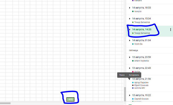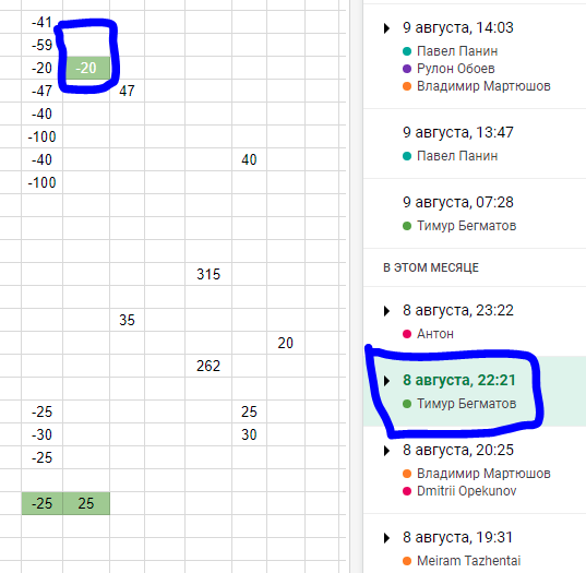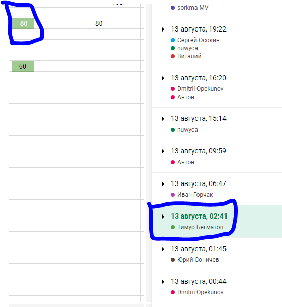 Вопрос провисел 2 дня без ответа, зато 14 августа вдруг чудесным образом без изменений балансов по румам, у тебя профит становится на 415 долларов больше в файле. Магия! Идем в историю гугл-таблицы с транзакциями, смотрим предыдущие версии и вносимые пользователями изменения. И что мы видим? Разгадка фокуса. Оказывается никакой магии, а лишь та самая "подделка документов"