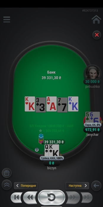 Кроме того, попробовал лимит 50/100грн. Около двух часов игры. Сначала слетел -185бб. Но за следующий час вернул все и ушёл со стола.