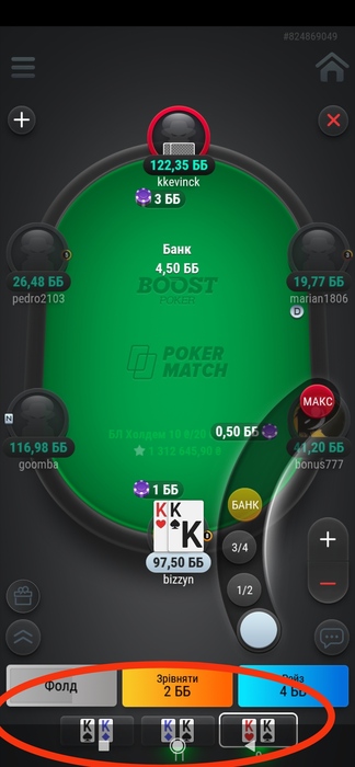 Интересно, что через полчаса аналогичная раздача с моими карманными королями и точно таким же флопом. На терне я поставил пол банка, но оппонент пошел в оллин. И снова я сбросил.