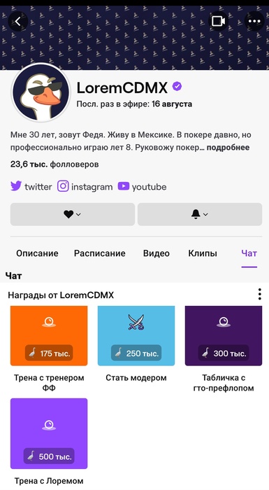 Здравствуйте, у меня есть для вас уникальное предложение, вы можете провести индивидуальную тренировку с Федором Трунцевым (LoremCDMX). Все мы любим смотреть за игрой профессионалов на твиче, так сложилось что я накопил более 500к гусей (баллы канала LoremCDMX) Вы сами можете выбрать на что их потратить.