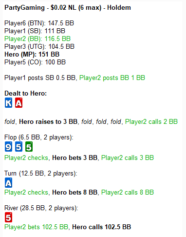 в тему топика раздача, чел мне не стал оплачивать даже пол банка, уверен у него фулл был по Q (К по риверу конечно ему сильно помог отскочить, так бы думаю заколил), но в целом ситуация у него куда сложнее