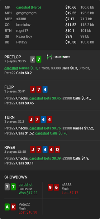 А вообще я бы тебя слабым игроком пометил и добавил нотс - блефует. Думаю многие уже так и сделали. Складывается ощущение что ты играешь в тильте или хочешь быстрее забрать банка (только зачем), чувствуется твой страх. Покер же такая игра, тут быстро можно только все проиграть. Пока тормозни с игрой, сэкономишь много денег. Лучше в солвере посиди
