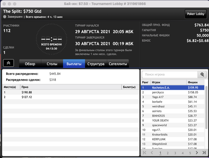 Сегодня ничего не выиграл, но хоть перестал проигрывать. Установил себе PokerTracker4 (других программ на Mac я не нашел) для анализа игры, но не совсем понял как это делать, да и пока разобрался как скачать руки с partypoker прошел весь вечер. Завтра продолжу ...