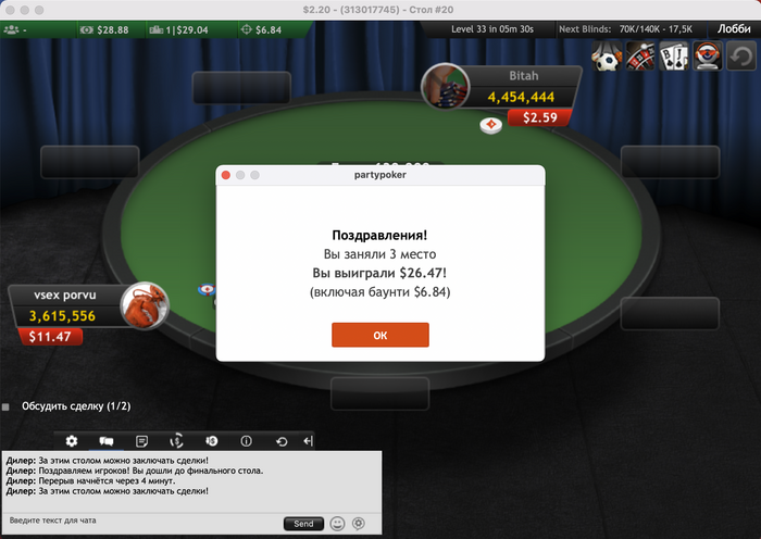 Вечер добрый! Меня зовут Евгений. Играю в покер больше 10 лет и все это время играю в 0. Пару недель назад нашел интересное предложение по обучению с доведением до результата, быстро согласившись. вкинул 40$ на Partypoker. Пока ждал начала обучения, случайно набрел на турниры PLO8, и о чудо, игра оказалась гораздо интересного обычного холдема. Про обучению я сразу позабыл, так как я совершенно не понимал как играть в PLO8, по резкому скачал умную книгу(Секреты пот-лимитной омахи хай-лоу), читая ее одним глазом, а другим смотря видосы на ютубе(nb_communist), затащил первый турнир в своей жизни: