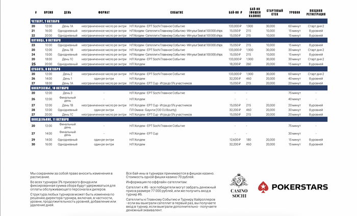 Вы можете активировать интересующий вас турнир и увидеть предварительное описание по структуре каждого в расписании https://www.pokerstarslive.com/ru/ept/open-sochi/schedule/