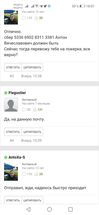 Вчера 25.09.2021 понадобились срочно деньги. Не знаю, нужно ли писать, зачем понадобились, но т.к. это повлияло на обмен, наверно напишу. Брат находится в Сочи и ему там неожиданно понадобились медицинские услуги. Свободных денег, что бы просто взять и отправить, не было. Пришлось искать варианты. Ну вот вспомнил про возможность обменов на ГТ, ранее этого не делал (один раз обращался по обмену, мне отказали, ну я и не особо удивился, на ГТ в целом появляюсь редко, какой то репутации нет, так что все логично, ну и больше к этому варианту не возвращался). Зашел в ветку обмена, вроде нашел подходящее, человек не давно апал свою тему и был онлайн. Я переживая (причина выше) и торопясь, посмотрел профиль, вроде все ок (ну я не эксперт, может там сразу видно, что не все ок), написал ему в личку на ГТ, он согласился на обмен. Я перевел ему на ГГ, сообщил ему об этом, он ответил, что скоро до компа доберется, проверит и отправит (хотя я думал что он уже был готов сразу к сделке, но тут я сам обосрался, не обговорив детали сделки, время). Прошли сутки, денег нет. На этом собственно gg.