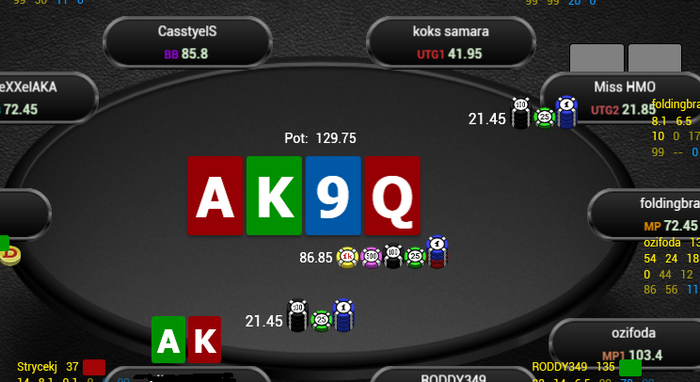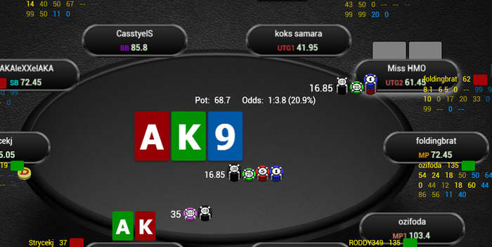 Alexandr53, мы играем снг-турнир, играй максимально проще. Не усложняй как под кеш игру или хедзап. Основный деньги ты выигрываешь на поздних стадиях турнира, запомни это. А какая-то раздача с АКо не должна усложняться, для простоты 3-бет можно оллын ставить)