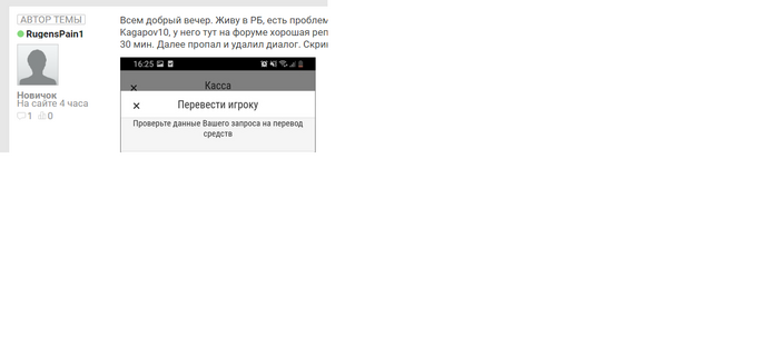 Всем добрый вечер. Живу в РБ, есть проблемы с выводом, решил вывести через гарант. Посоветовали человека с ником Kagapov10, у него тут на форуме хорошая репутация. После перевода скинул ему отчёт с мыла, он ответил что скинет в течении 30 мин. Далее пропал и удалил диалог. Скрины прилагаются. Посоветуйте что делать? Запить водой или есть надежды?