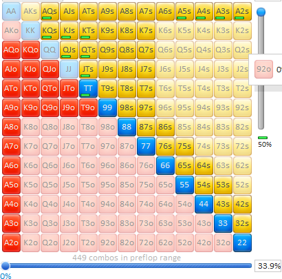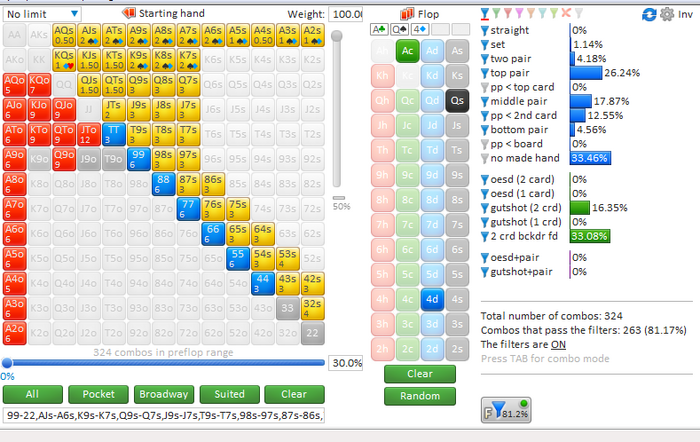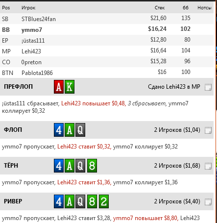 Lehi423, Да в целом норм, кроме одного. На флопе нет смысла играть от 1/3. У чела статы выигрыш на вскрытие 53 и доход до шоудауна 29, никогда в жизни там не будет мелких карманок и мусора, который ты ему заложил(J7; T7 и так далее) тем более на доске с 2-мя оверкартами, одна из которых туз. Да и вообще слишком странный диапазон продолжения ты ему построил. Больше для чела со статами 68 на 23, с wtsd 40 WSD 41. Поэтому, нужно конечно же увеличивать сайзинг.