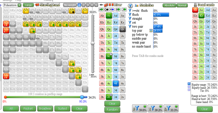 Судя по тому, что опп может вколить на ривере на такой сайз как я влепил у нас есть 76% фолд еквити и 18% эквити.