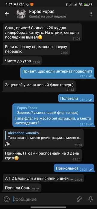 Далее я выложил ссылку на эту тему в чате, но самому Дэну не понравилось, что мы у него какие-то финансовые разборки устраиваем в чате, модер Фэймс (клевый пацан, кстати) реагируя на это попросил нас удалиться в личку, что я и сделал.
