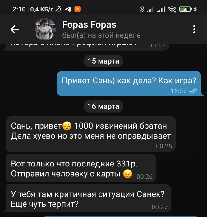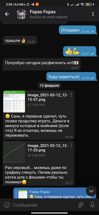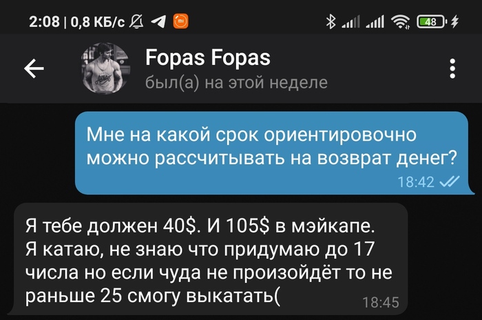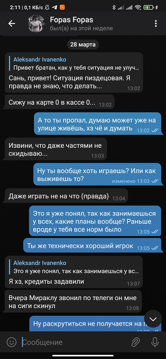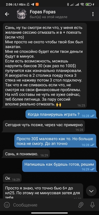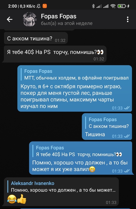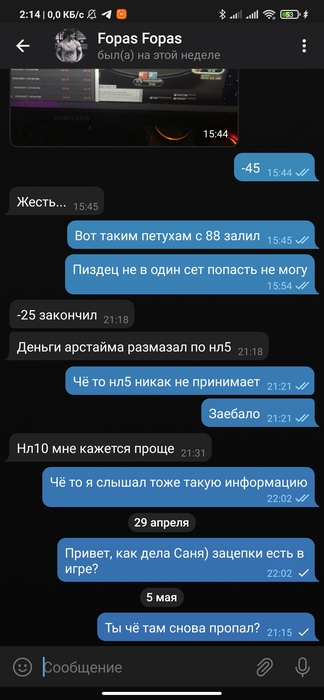 Продолжительное время были в одной конфе в телеграмме по short deck, переодически занимал и отдавал, далее была тема касательно бекинга с мейкапом, бекинг он быстро слил и начал кормить завтраками. Началось в марте 2021 года до нынешнего времени долг не отдал.