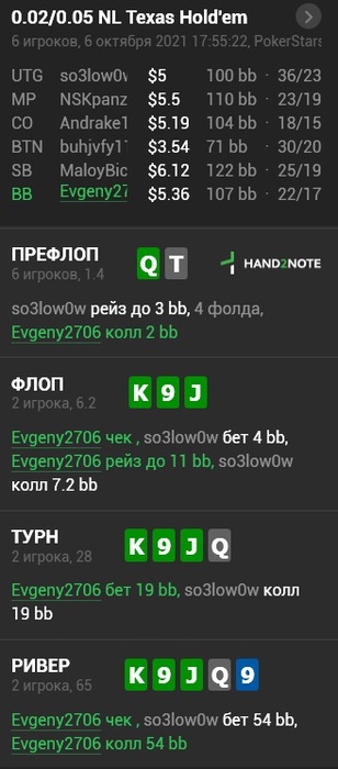 Evgeny2706, ривером у тебя 1 вариант - это чек и пас. Ривером у оппа по прежнему есть все флеши, стриты и фулы в диапазоне, в то время как у тебя из вэлью ничего кроме флэшей нету, фулов просто ноль). Ты в лучшем случае коллишь на сплит против такой же руки как и твоя (которая никогда не проставит к слову, т.к. непонятно с чего она добирает) Что там из блефов? Их ноль, разве что превращенные , , , что имеет мало отношения к реальности микролимитов.