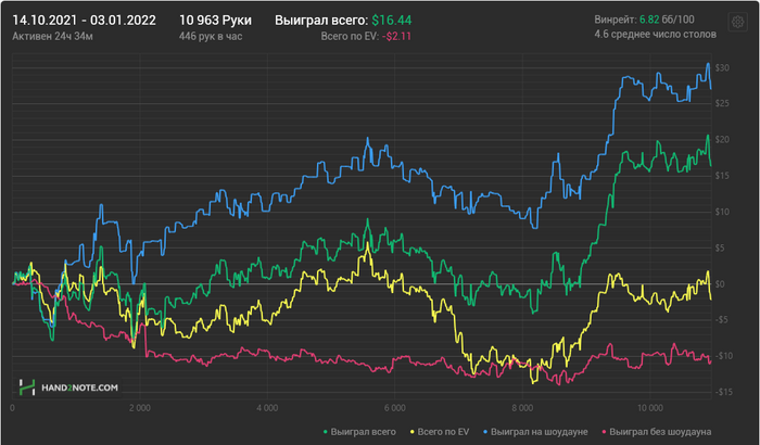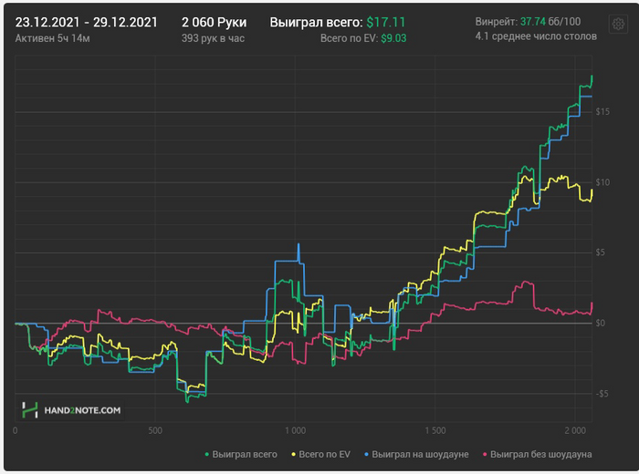 Всем привет, не выкладывал раздачи и не заходил на форум вообще, потому что даже не знал что выкладывать и что писать. По игре все складывалось не важно до начала ноября, пока не наткнулся на бесплатный курс для начинающих по NL BSS. Решил: «в задницу литературу и прочее». Начал с самого начала, чарты, причины ставок Ev/FoldEV, математика коллов в роли префлоп-колера. Вообщем все, что давали в этом курсе впитывал в себя как губка, некоторые уроки по основам постфлопа и фундаменту игрока в покер пересматривал по несколько раз, чтобы лучше усваивать информацию. С начала декабря начал ощущать себя увереннее и по тихому графики начали идти вверх. Изменил подход к игре, теперь играю не когда получится, а поставил цель на игру каждый день, минимум сессия 60 минут и 60-90 минут выделяю на работу над игрой чередую просмотр урока из курса, разбор своих раздач и просмотр сессий тренеров с различных ресурсов. Заметил, что спокойнее переношу переезды своих АА (для меня достижение), чуть позже выложу график за декабрь. И новый год начну плотно с обучения, и выкладывания графика за каждый день. Цель на январь, добить БР для шота на NL5, начнём с малого). Всех с наступающим и успешного 2022 года 🙌