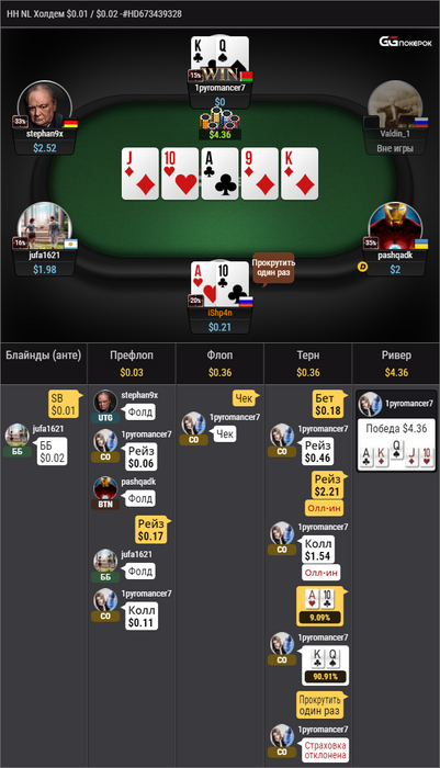 Попал за стол к парням с впипом 90/40, 80/30, 60/5. Подумал, что вот оно мое счастье, но ривер из-за угла пару тройку раз влепил мне доской по лбу. И меня понесло . Поэтому не стал сегодня выкатывать даже минимум. Надо поработать над психологическими аспектами