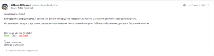 У меня деньги обменял и на GG написал,что "что перевод на annanagornyak1@ukr.net осуществлял не он, а мошенники"