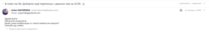 Ещё на мой емей,который привязан к GG,было входящее письмо от емейла - с которого и были отправленны 4680$ на GG: