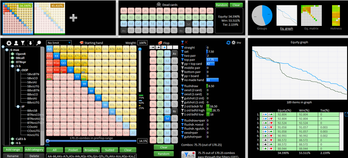 Вообще не понимаю почему у гто+ создается такой большой чек на А-хай доске, хотя у СБ перевес по эквити и по идее в треть можно отправлять большую часть ренжа. На треть от бтн, в чек-рейз уходят всего 5-6%, остальные 50% играют чек-кол, еще 30% просто фолд. Хотя тот же мусор по типу QJo можно было отправлять в бет, прикрывая это сильными тузами. (ошибки в расчётах вроде нет)