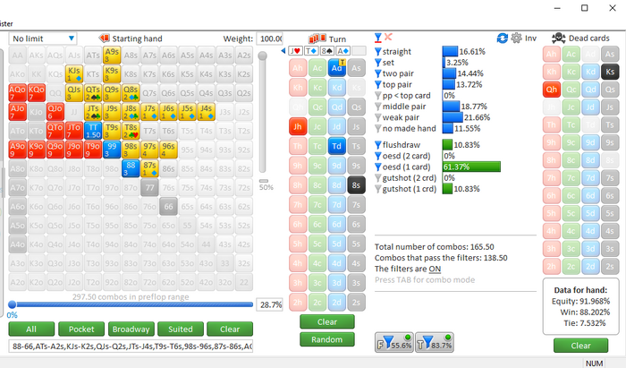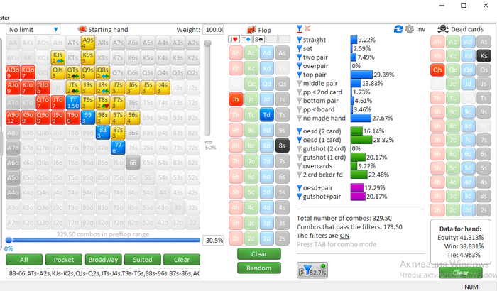 На флопе мне нужны было 28% эквити на колл, у меня было 41%, по этому мы поехали на тёрн.
