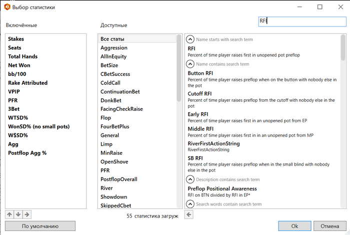 Определение: Raised first in (RFI) - отслеживает процент случаев, когда игрок сделал опен-рейз на префлопе, учитывая что у него была такая возможность. Этот стат отличается от PFR, так как PFR просто отслеживает общий процент рейзов на префлопе и не учитывает, была ли возможность сделать опен-рейз. Raise first in (by position) разделяется на пять отдельных статов, которые можно найти при помощи фильтров, и каждый будет показывать результаты только для одной конкретной позиции. Вот пять статов для показателя Raise first in (by position): УТГ/хайджек/кат-офф/баттон/малый блайнд.