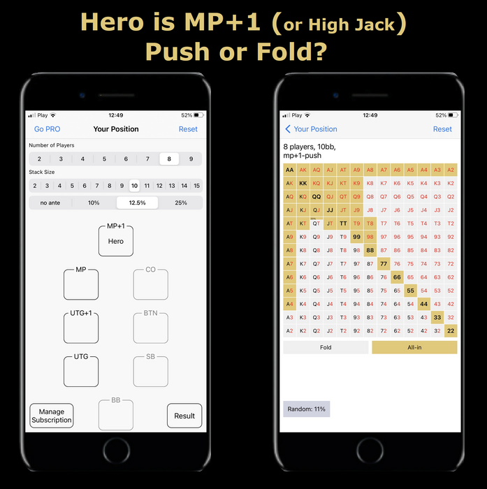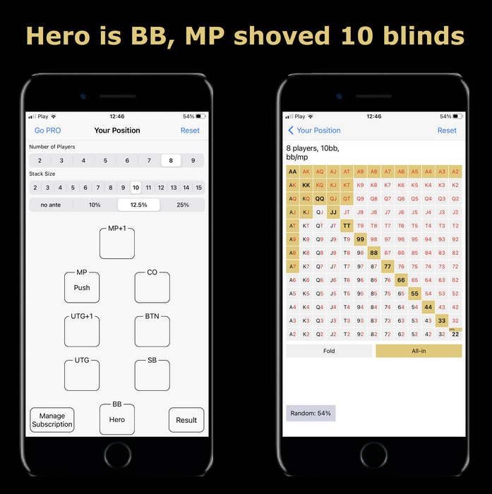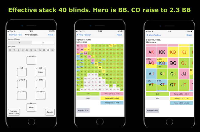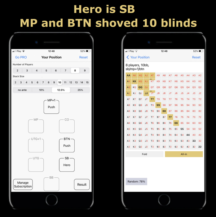Hold’em GTO — приложение для совершенствования NLH MTT на префлопе. Мы произвели сотни миллиардов симуляций и нашли ГТО решения для каждого хенда для большинства префлоп ситуаций.