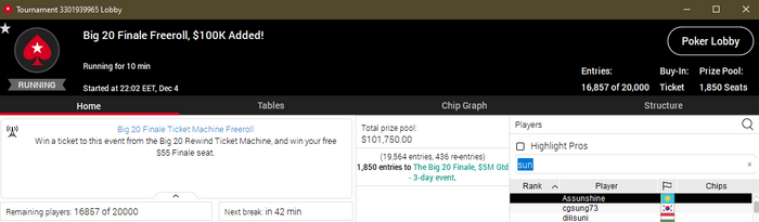 Сегодня проходил фрееролл на главное событие Биг20. Для получения билетов надо было выполнять ежедневные задания. За две недели, накатал на два входа, у друзей были и по-больше билетов. Условия были, что за время поздней реги (15 минут) можно сделать до двух ре-ентри. Класс! Есть запасной вход, пихаем , проигрываем , идем регатся а там.... достигнуто 20К игроков, все свободны, всем спасибо. Успели сделать второй ход только 436 особо буйных.