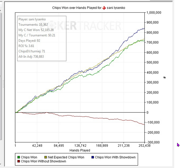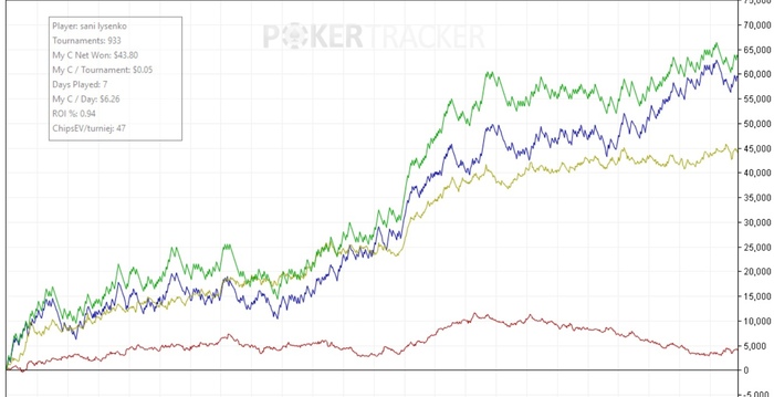 Такое начало игры, как можно понять, не очень положительным образом сказывалось на моей игре и морально-психическом состоянии в целом. Все-таки за год я отвык в целом от покера, не говоря уже от стратегий игры, которые использовал, да и от дисперсии тоже отвык, как и в целом от образа жизни покерного регуляра. В некоторые моменты я очень сильно бесился/тильтовал, даже бил кулаком по столу о того, что не складывается, особенно когда на отрезке 2.5к турниров я видел картину в 55 фишек. Слава богу, за последние 500 турниров диспа повернулась ко мне не тем местом, которым она поворачивались до этого, поэтому удалось подкорректировать результат до 62 фишек. Это отчетливо видно на итоговом графике.