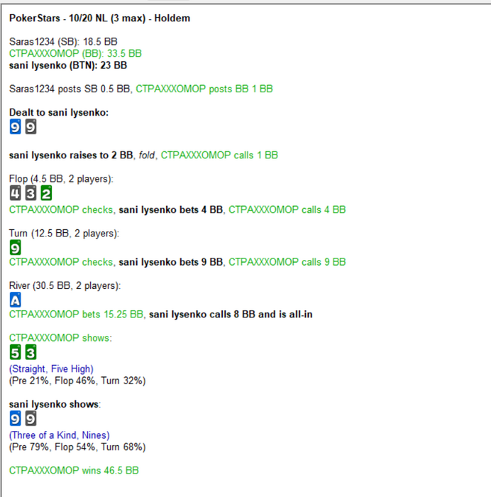 покерспины стали основным занятием/ заработком по жизни и для интернетно-покерной социализации он и создается.Коротко о себе: 22.5 года, живу в РБ, имею высшее образование (Юрист-международник), но по профессии ни разу не работал (за исключением практики в адвокатском бюро (1месяц)и 2 месяца в Следственном Комитете РБ). С покером знаком очень давно, еще с лет 10 играли с братом и другом. Изначально это были спички и всякие штучки, которые могли заменить фишки, но потом мы купили набор и тут понеслось. Радости не было предела. Затем регистрация на старзах, игра 0.25-ки и какие-то снгшки и мтт (1-2$ ) фо фан на протяжении лет 6 без особых результатов, но и не в минус. Долларов 400 может выиграл за все время. До сих пор помню ощущение дикой радости после того, как занес мтт за 1.1 и получил за первое что-то около 150 баксов. На тот момент я был бедным студентом, который учился без стипухи и эти 150 баксов казались колоссальным достижением, если учесть то, что я мог месяц и на 50$ прожить. Но по итогу где-то года 2 назад познакомился со спинами и начал кое-как их играть, улучшая свою игру с товарищами, которые играли выше меня. Результат годовалой давности на винамаксе, база которого еще осталась на ноуте(5$):