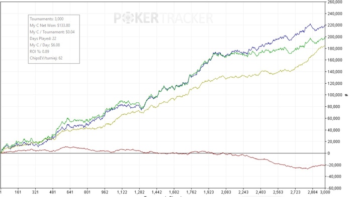 2) Смотреть график ИСКЛЮЧИТЕЛЬНО раз в 1к турниров. Поэтому график я посмотрю только 4 раза за весь пул, а не как это было в этом периоде. Обновлял график если не каждую раздачу, то каждые 5-10 турниров мог смотреть стабильно. Сейчас такого не будет. И, самое главное, вне зависимости от результата, хорошо складывается или плохо по ощущениям, я все равно обещаю сам себе не заглядывать туда, так как ни к чему хорошему это не приводит.
