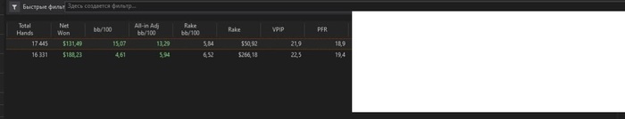 Одно дело катать с рейком ~10бб/100 и с хорошим РБ по промам/гонкам вполне себе условия, но пытаться бодаться с регодрочем при рейке в ~15бб/100 на сотке-двухсотке, где прям откровенных фишей уже мало такое себе удовольствие.