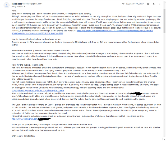 Хочу сказать что во всех своих переписках с PokerStars без исключения, я всегда вел очень аккуратный, вежливый и понимающий стиль общения. Никогда не срывался, всегда относился внимательно к деталям. Даже сейчас в случае бана, максимально старался содействовать саппорту, полностью открыто и с доверием вел переписку для скорейшего решения вопроса.