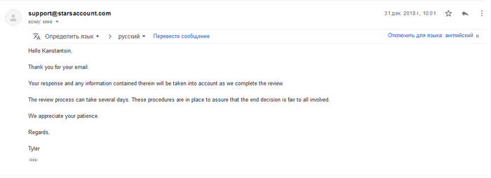 Учитывая что сообщение было прислано 31 декабря, времени до нг оставалось очень мало. Тем не менее, понимая что ускорить процесс проверки я врядли смогу, зато попробовать попросить у саппорта дать мне возможность играть следующие 24 часа без возможности кешаутов можно. Опять таки, мотивации играть именно на старз, даже можно сказать “из бана” - было много. Т.к. был на 300% уверен в сохранности средств и последующем разбане.