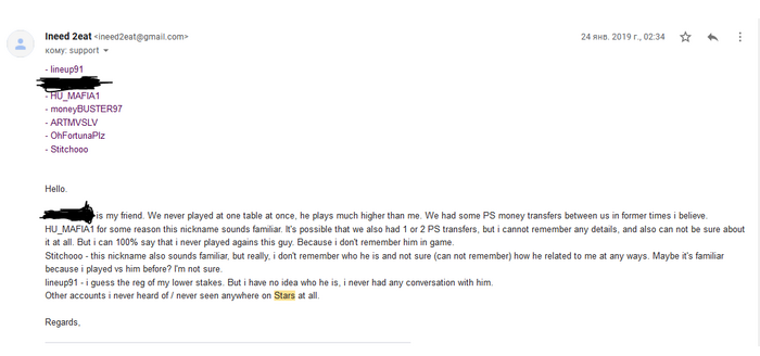 Детали сообщения важны, поэтому я постараюсь так же пояснить тут и на русском. Единственное, что вы должны учесть - на тот момент и до, я был активным тренером. Ученики могли расплачиваться переводами на PokerStars. Поэтому ряд этих никнеймов мне мог казаться знакомым по разным причинам, но в точности насчет каждого, кроме одного, было сказать сложно.