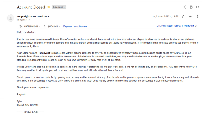 Исходя с вашей близкой ассоциации с забанеными аккаунтами, мы решили что это не в лучших интересах для наших игроков - разрешать продолжать играть вам на нашей платформе. Мы не можем брать на себя риск, что кто-либо из них получит доступ к нашим столам через ваш аккаунт. Мы сожалеем что вы стали очередной жертвой их противоправного поведения.