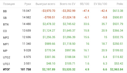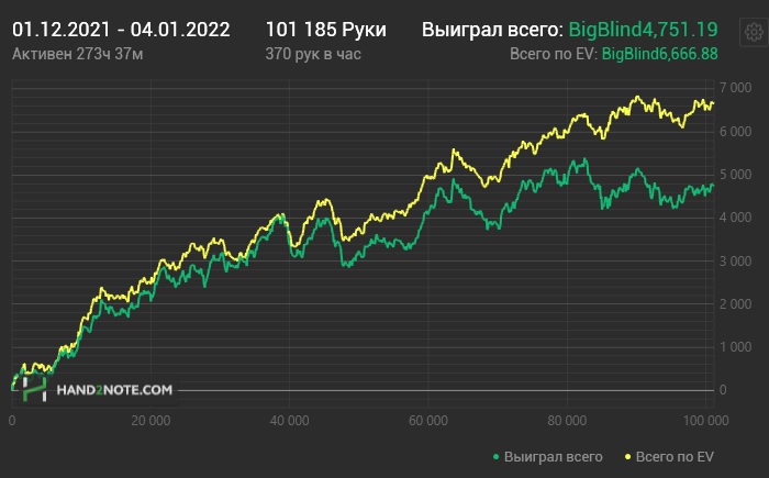 Добил я до своего отрезка 100k рук. Вышло как то так. В 4 бб, кароче, с хвостиком.