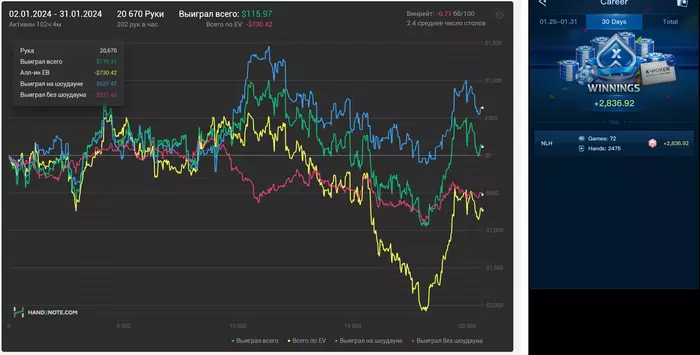Клубов тонна, а больше 200 рук/час собрать всё равно не могу, плюс очень разношерстная игра, какие-то эмуляторы вертикальные, какие-то горизонтальные, где-то игра с бомбпотами от 1-10бб, где-то с анте 0,1-1 бб, где-то с баунти за победу с 72o, где-то со стэнд-ап баунти, поэтому задача на март определиться с тем, что из добавленного точно нужно оставить, а что отнимает слишком много концентрации и скорее вредит катке.